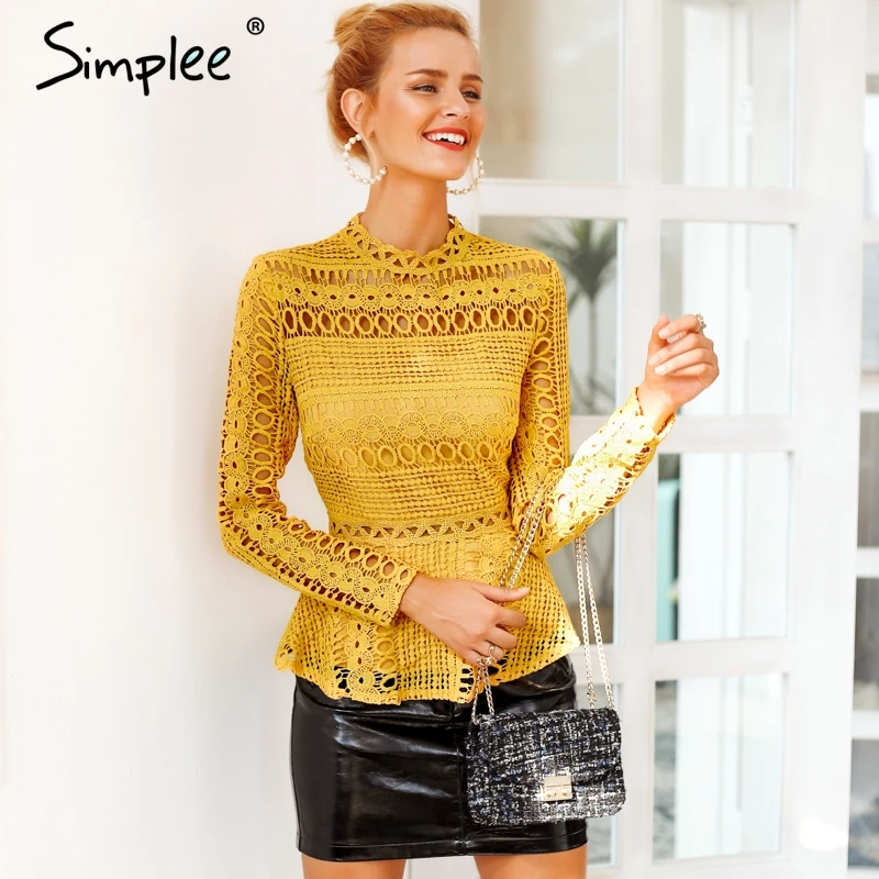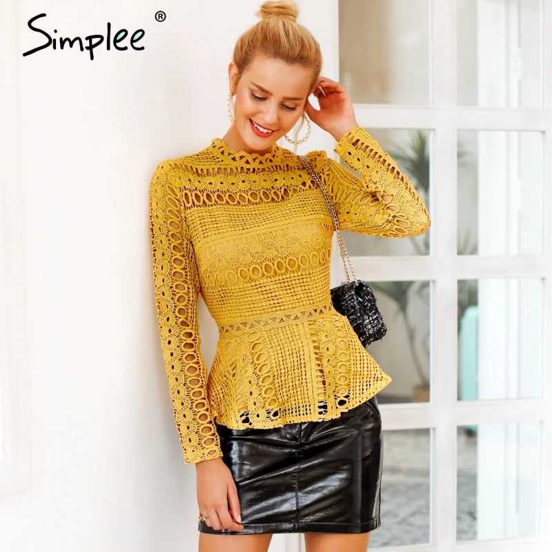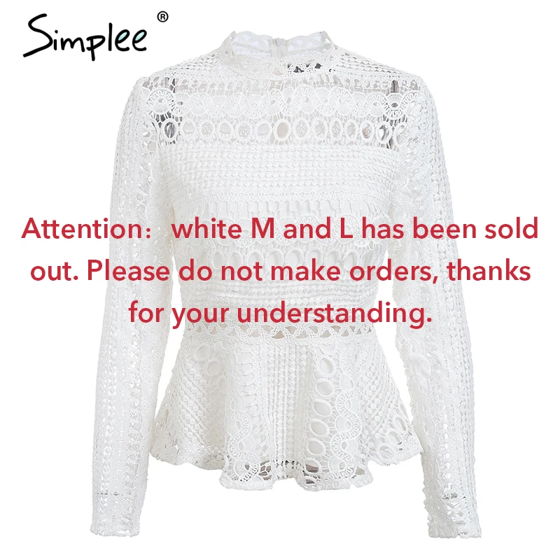 Product Name: Simplee élégant dentelle évider peplum blouse chemise femmes volants à manches longues blanc blouse femme automne hiver hauts bureau dame