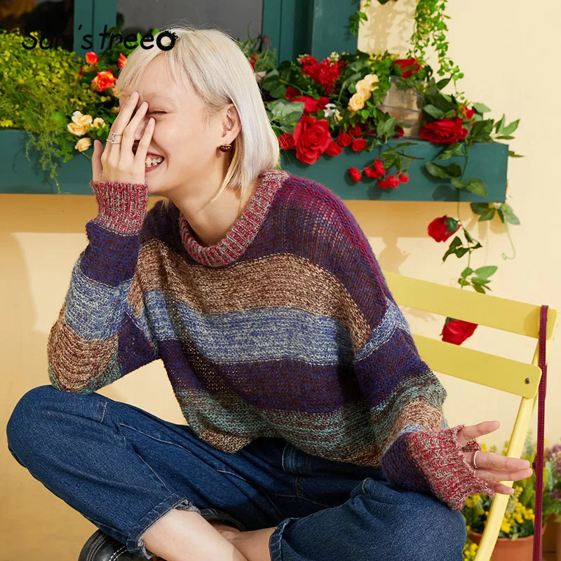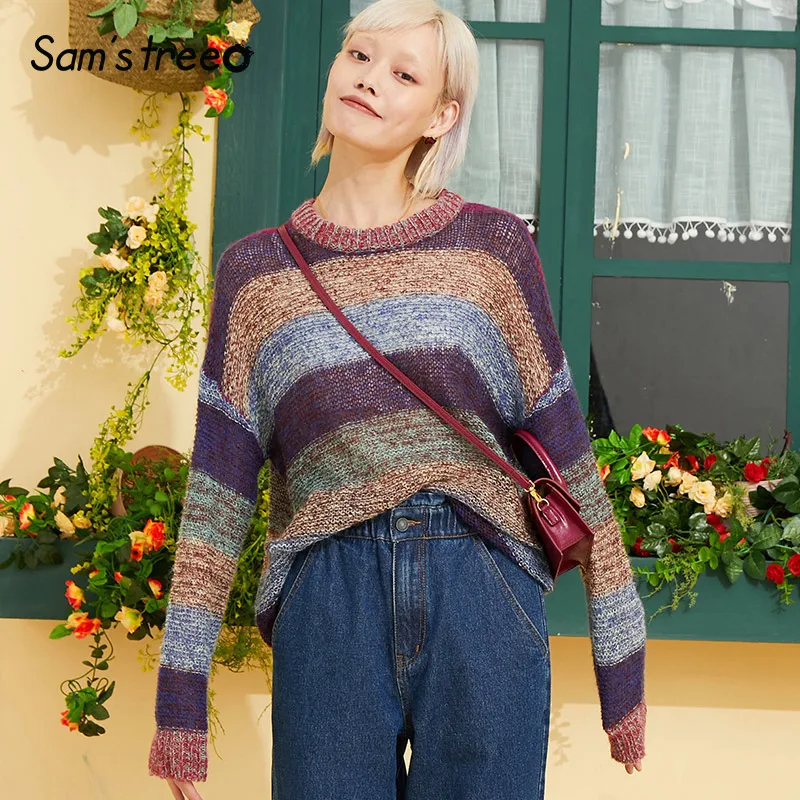 Special Offer Samstree Vintage rayé femmes chandails, 2019 automne mode o cou décontracté femmes hauts Streetwear corée lâche Femme chandails Discount 53% Today!