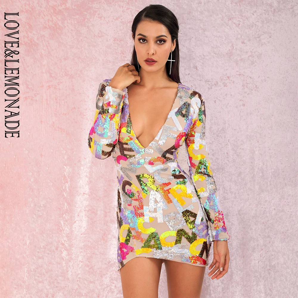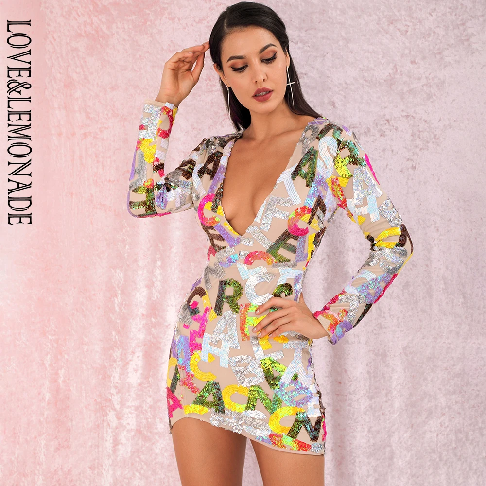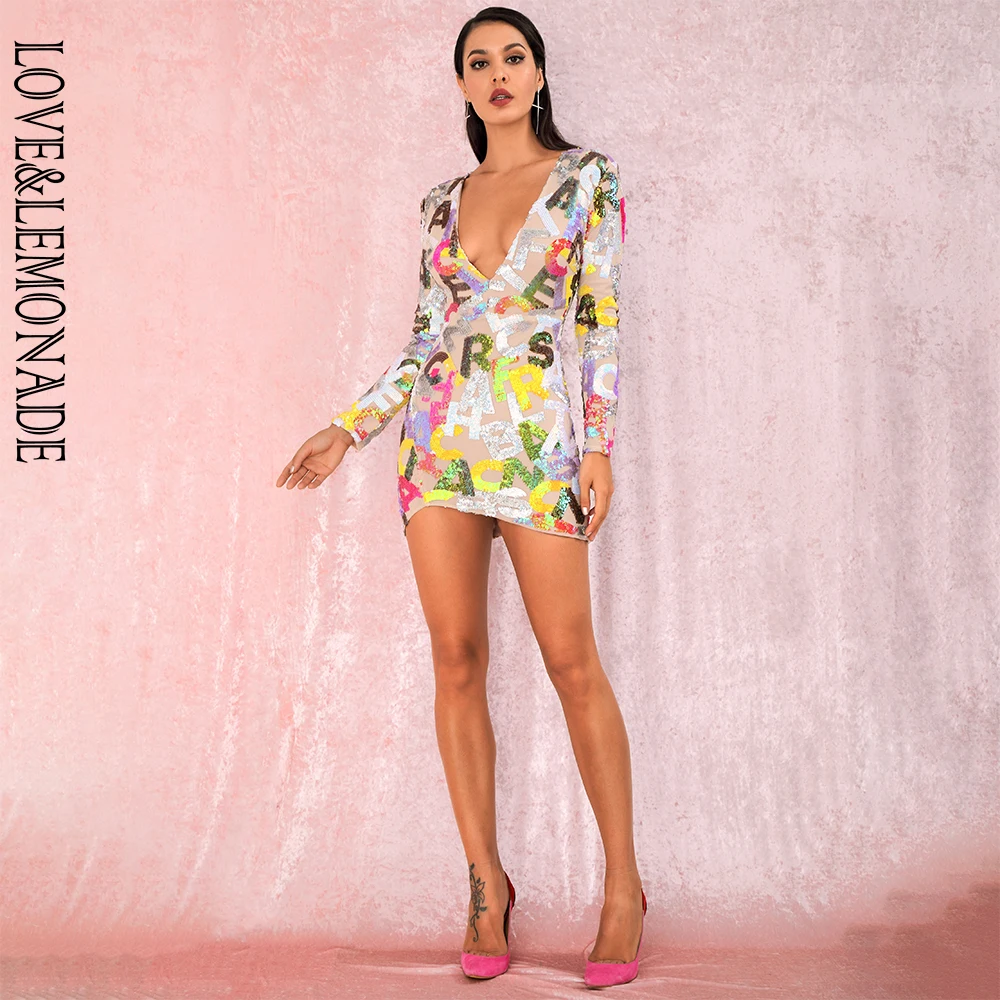 Special Offer LOVE limonade Sexy col en v profond découpé lettre paillettes moulante à manches longues fête Mini robe LM82121 Discount 15% Today!