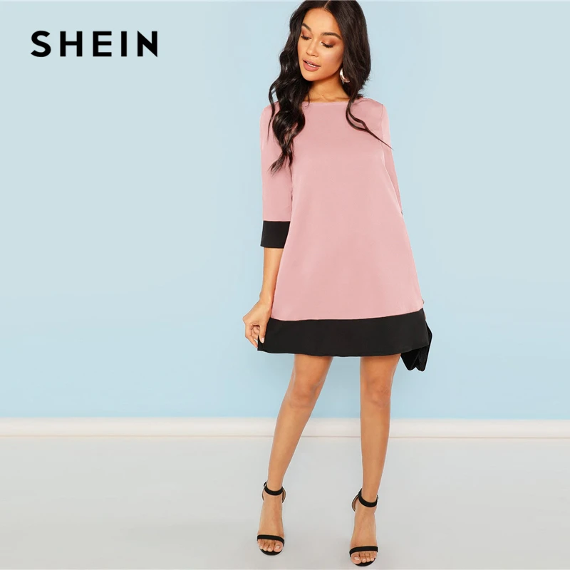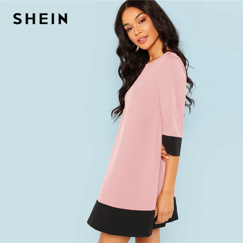 Special Offer SHEIN rose bureau dame Colorblock contraste garniture tunique o cou 3 4 manches droite robe automne vêtements de travail élégantes femmes robes Discount 40% Today!